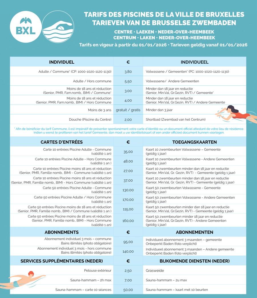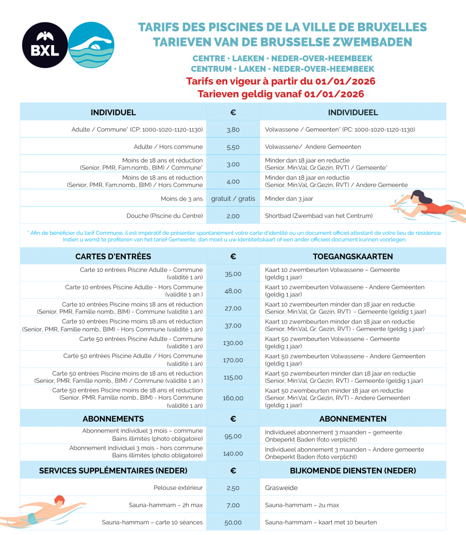 Afin de bénéficier du tarif Bruxellois, il est impératif de présenter spontanément votre carte d'identité ou un document officiel attestant de votre lieu de résidence (voir Politique de Confidentialité: "l’achat de la carte / abonnement et l’utilisation des services de l’ASBL signifient que vous consentez au partage des données à l’inscription et àrespecter le réglement des piscines"). Toute réclamation doit être transmise par écrit à l'adresse suivante : piscine.centre.bad@brucity.be